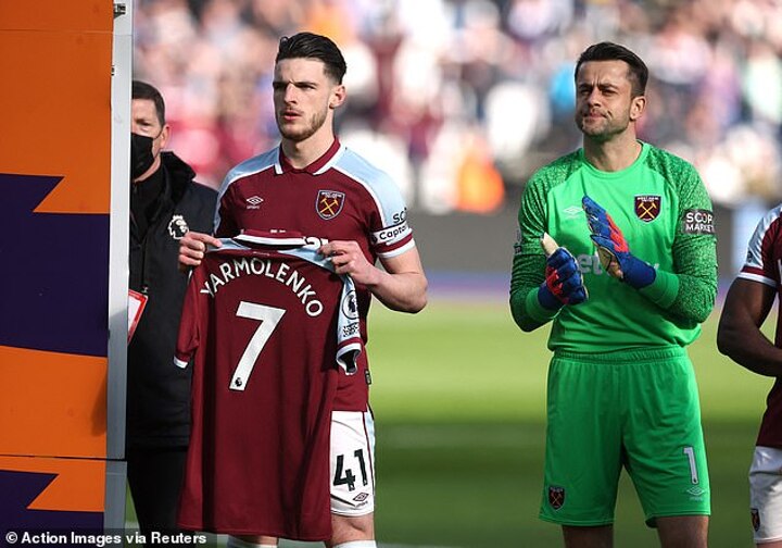 Yarmolenko, who is his country's third most-capped player of all time, was granted compassionate leave by West Ham on Sunday and therefore missed their win over Wolves, but all of his team-mates wore shirts with his name on the back during their warm-up.