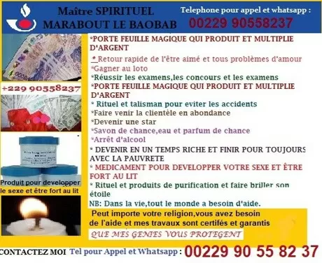 SURTOUT TOI JEEUNES,NE LAISSE PAS PASSER CETTE OPPORTUNITÉ C'EST DÉSORMAIS LA FIN DE VOS PROBLÈMES SAISISSEZ CETTE OPPORTUNITÉ POUR AFIN DE CHANGER VOTRE SITUATION Je suis maître spirituel le Baobab.Diplômé de l'Association des Praticiens de la Médecine Traditionnelle Béninoise APMTB DOMAINE D'INTERVENTION ** PORTE FEUILLE MAGIQUE sans sacrifice . **GAGNER AU LOTO GAGNER AU CONCOURS ET COMPETITION - Attirer de la clientèle pour votre commerce. - Rituel et Talisman pour éviter des accidents de tout genre toute votre vie. - SAVON DE CHANCE - PARFUM DE CHANCE - Retour rapide de l'être aimé. -Rituel pour finir avec les problèmes d'emploi et avoir de promotion. -Etc.... En cas exeptionnel,j'envoie des produits par la Poste ou par DHL ,et surtout,avec moi,c'est la satisfaction. MES MEILLEURS VOEUX À TOUS