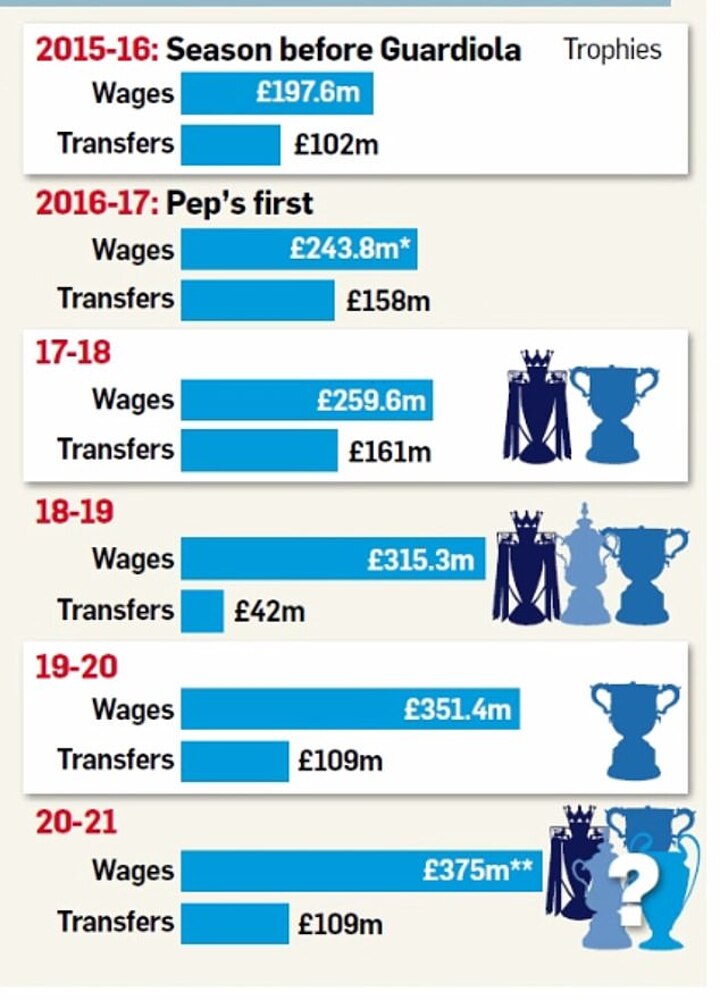 When net transfer spending of £579m in the same period is added, City have spent more than £2.1 billion so far on buying players and paying staff during the Spaniard’s reign.