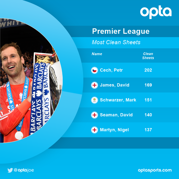 202 – Cech has kept 202 Premier League clean sheets, a competition record. He has kept the opponents off the scoresheet in 46 per cent of his matches.
