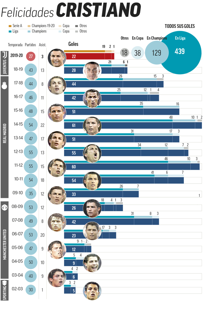 His first came on October 7, 2002, and he bagged five for Sporting, he has 50 for Juve, 99 with Portugal, 118 at United and 451 with Madrid.
