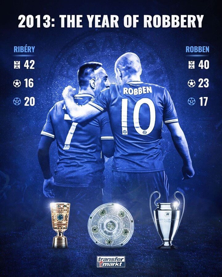 2013 certainly belongs to Bayern's iconic duo Robben and Ribery. They scored 39 goals and delivered 37 games together in all competitions for Bayern and won the Champions League, Bundesliga title and the DFB Pokal.