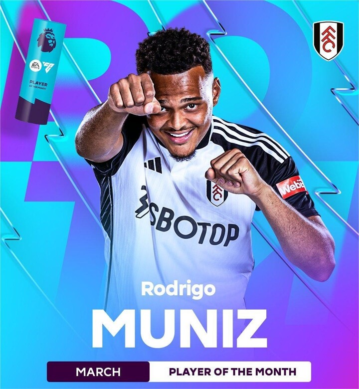Fulham striker Rodrigo Muniz has been named Premier League player of the month for March after netting four goals in as many games for the Cottagers.