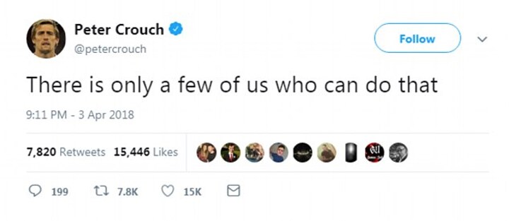 'There is only a few of us who can do that,' Crouch tweeted, referencing the goal he scored for Liverpool against Galatasaray in the Champions League.