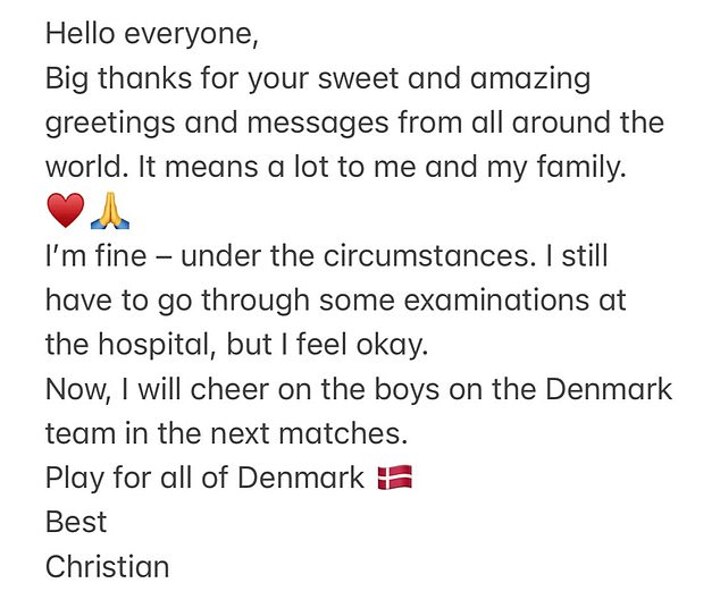 Eriksen's statement read: 'Thank you, I won't give up. I feel better now - but I want to understand what's happened.