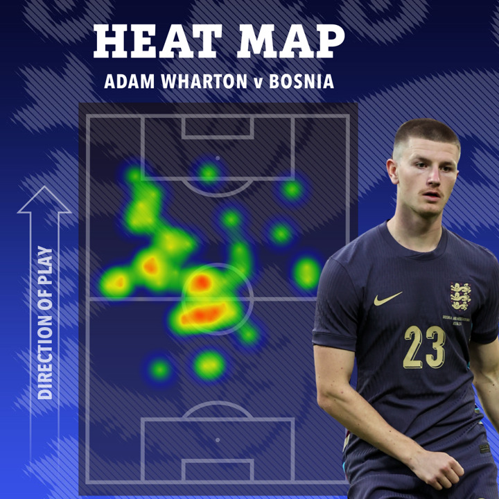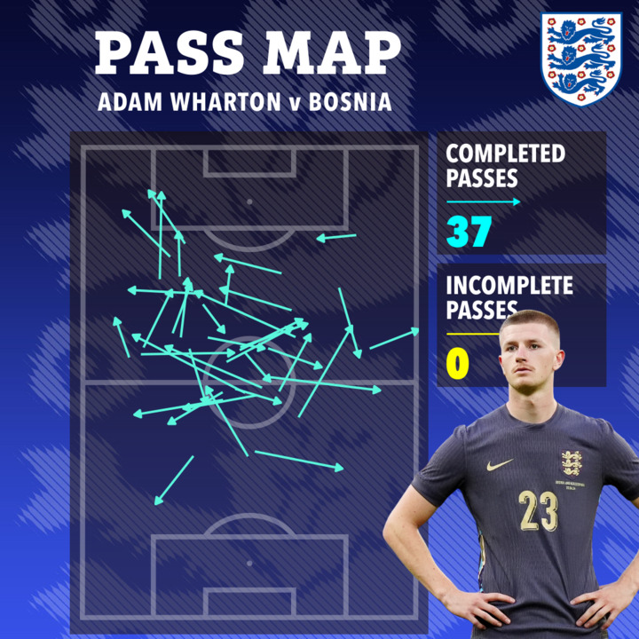 Since Opta stats began in 2008, Wharton became the only midfielder to attempt 30-plus passes on his England debut and complete every single one — 37 out of 37.