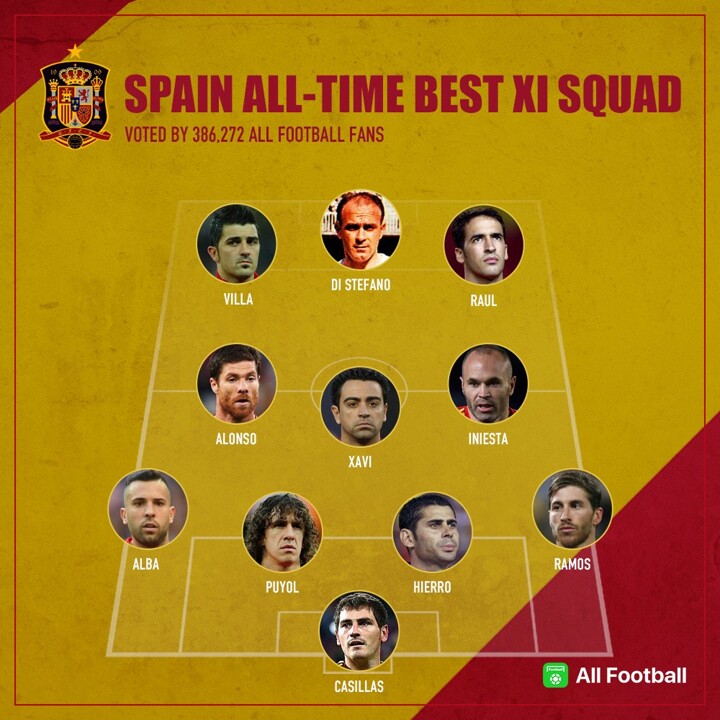 As one of eight national teams to have been crowned FIFA World Cup champions, Spain is loved by football fans for its numerous stars and gorgeous tactics. We released the vote of All-time Best XI of Spain yesterday, and the results are as follows: