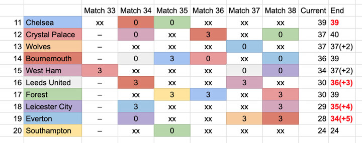 So, if Chelsea finish with 39 points, that means Bournemouth will have finished with at least 39 as well, while Nottingham Forest would need to only beat bottom-half sides Southampton and Crystal Palace to do the same. Palace meanwhile can beat Bournemouth freely to get to 40 points.