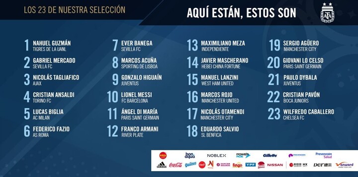 1 Nahuel Guzman, 2 Gabriel Mercado, 3 Nicolas Tagliafico, 4 Cristian Ansaldi, 5 Lucas Biglia, 6 Federico Fazio, 7 Ever Banega, 8 Marcos Acuna, 9 Gonzalo Higuain, 10 Lionel Messi, 11 Angel Di Maria, 12 Franco Armani, 13 Maximiliano Meza, 14 Javier Mascherano, 15 Manuel Lanzini, 16 Marcos Rojo, 17 Nicolas Otamendi, 18 Eduardo Salvio, 19 Sergio Aguero, 20 Giovani Lo Celso, 21 Paulo Dybala, 22 Cristian Pavon, 23 Wilfredo Caballero