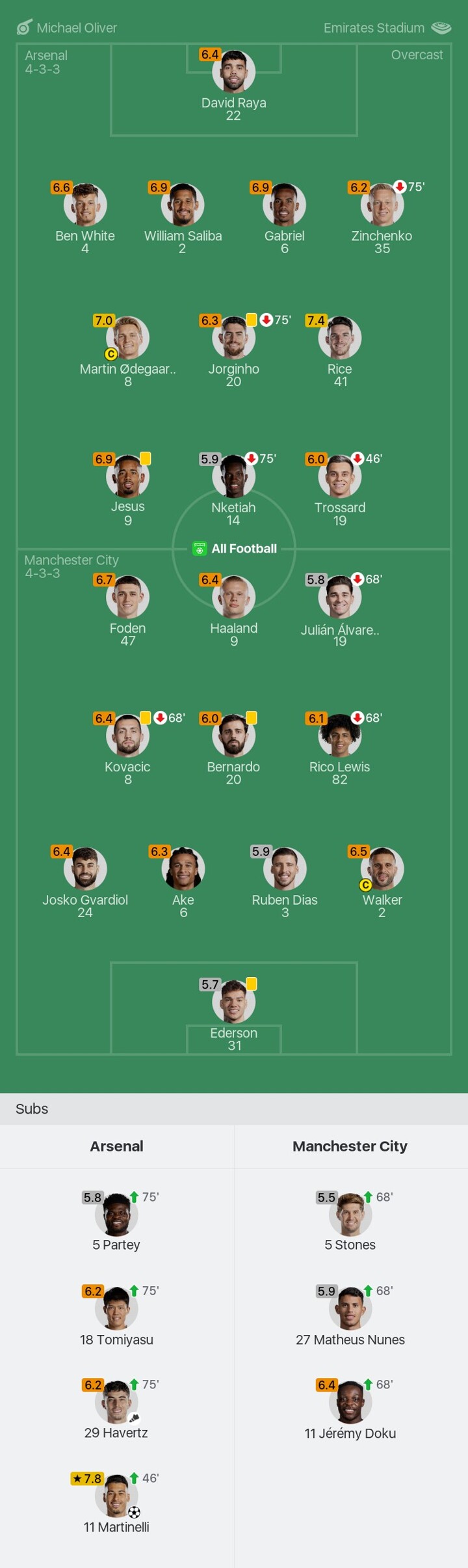 We bring you the player ratings for Arsenal vs Manchester City as Martinelli becomes Man of the Match with a rating of 7.8.