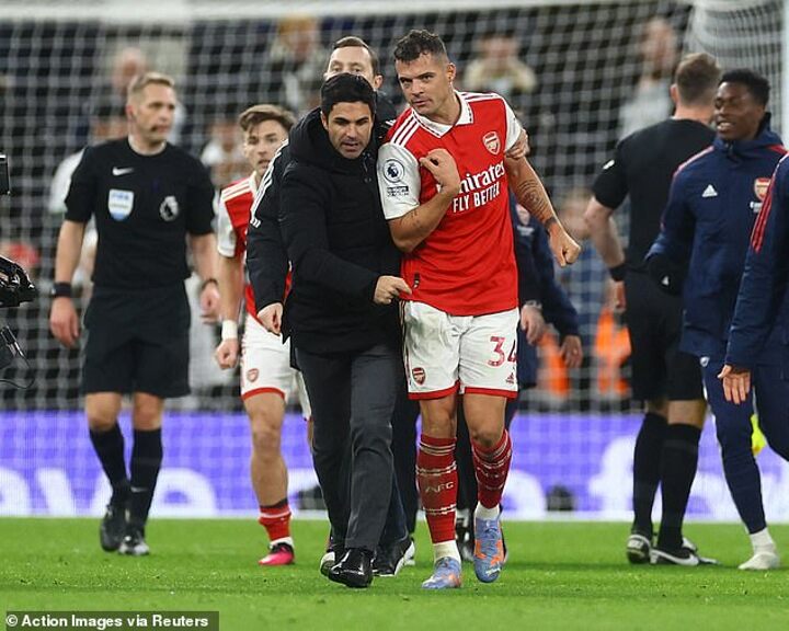 Viewers were left in hysterics as they watched Arsenal manager Mikel Arteta chase after Granit Xhaka to stop him clashing with Tottenham's players after Sunday's huge victory.