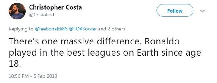 'There’s one massive difference, Ronaldo played in the best leagues on Earth since age 18,' another responded.