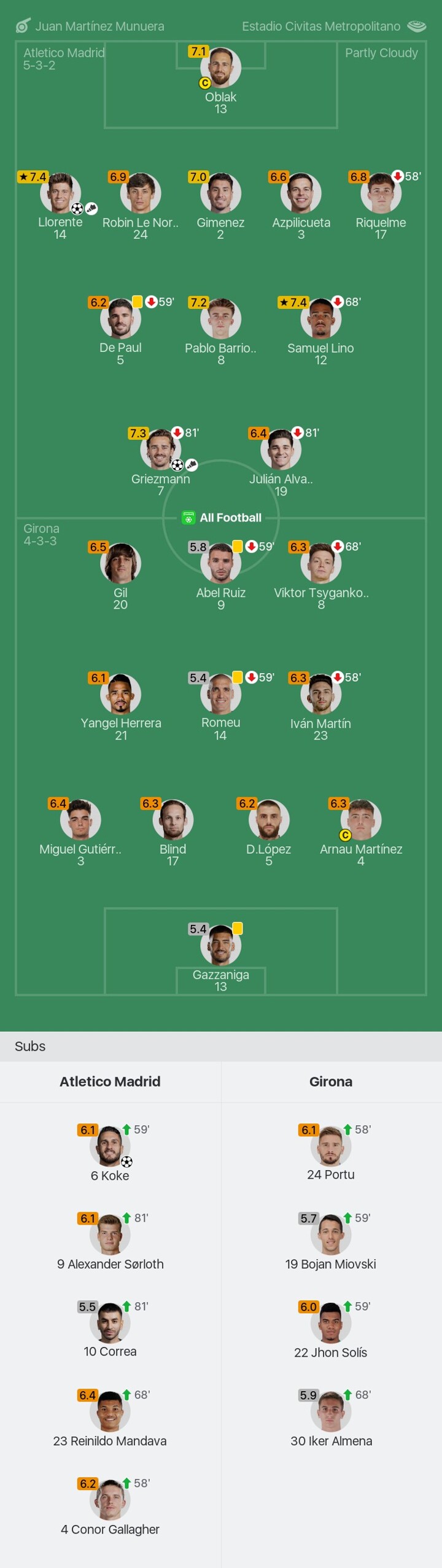 We bring you the player ratings for Atletico Madrid vs Girona as Llorente becomes Man of the Match with a rating of 7.4.