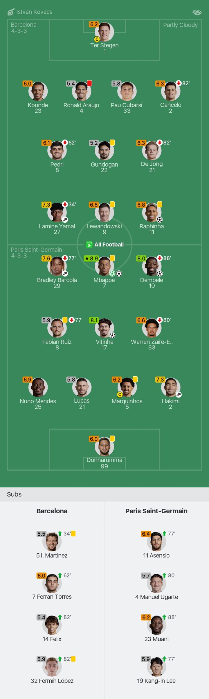 We bring you the player ratings for Barcelona vs Paris Saint-Germain as Mbappe becomes Man of the Match with a rating of 8.9.