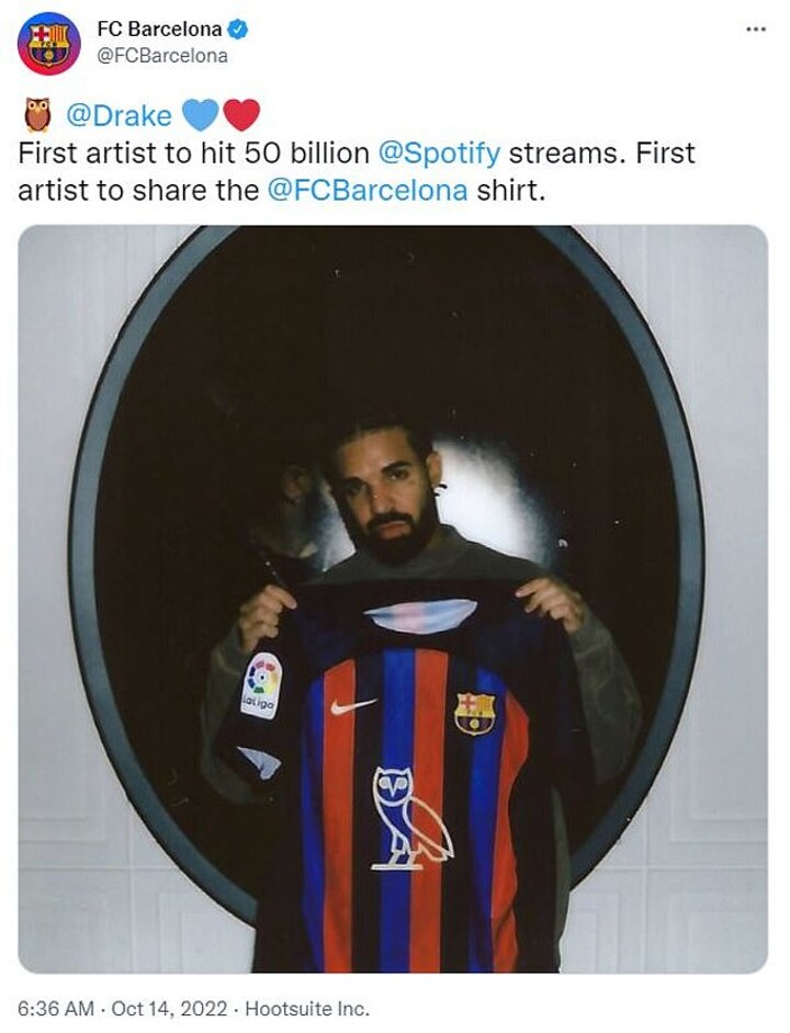 'On October 16, instead of seeing the world’s most popular audio streaming subscription service logo on the front of the Barça jersey, those watching the game against Real Madrid will see the silhouette of an owl - the logo of the Canadian singer’s brand,' Barcelona said.