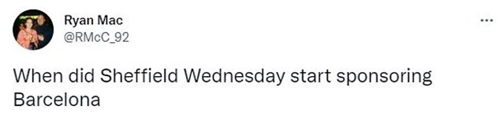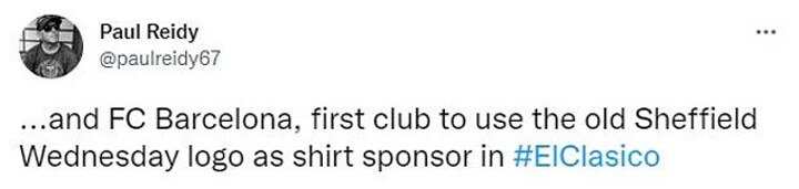 Another quipped: '...and FC Barcelona, first club to use the old Sheffield Wednesday logo as their shirt sponsor in the El Clasico.'