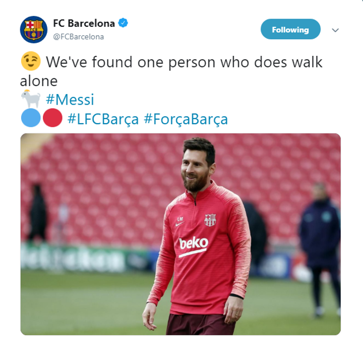 But following Divock Origi' s opening goal, Barcelona's official Twitter account still believed the Catalan side were guaranteed a win.
