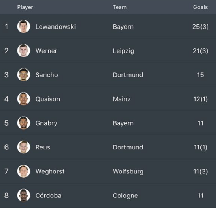 The duo's prolific form in front of goal resulted in them scoring at least 18 goals each after the first 16 matchdays this campaign, the first time this has happened in Bundesliga history. It was Lewandowski who narrowly led the way with 19, with Werner just one behind around the turn of the new year.