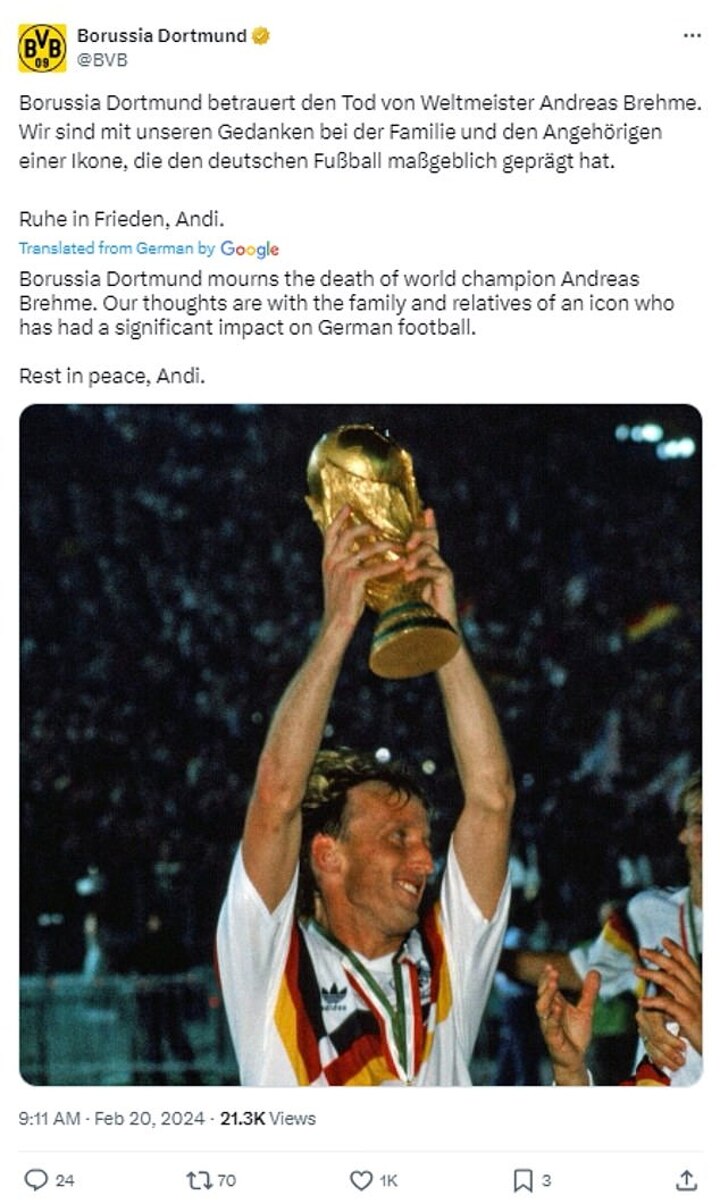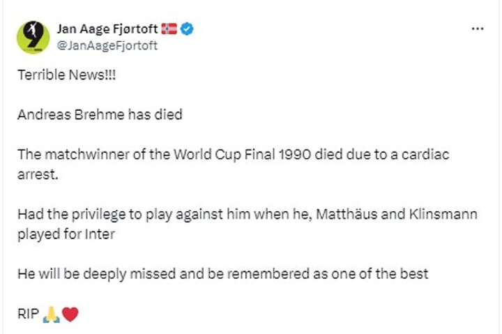 Jan Aage Fjortoft wrote on X: 'Terrible News! Andreas Brehme has died The matchwinner of the World Cup Final 1990 died due to a cardiac arrest. Had the privilege to play against him when he, Matthäus and Klinsmann played for Inter. He will be deeply missed and be remembered as one of the best. RIP.'