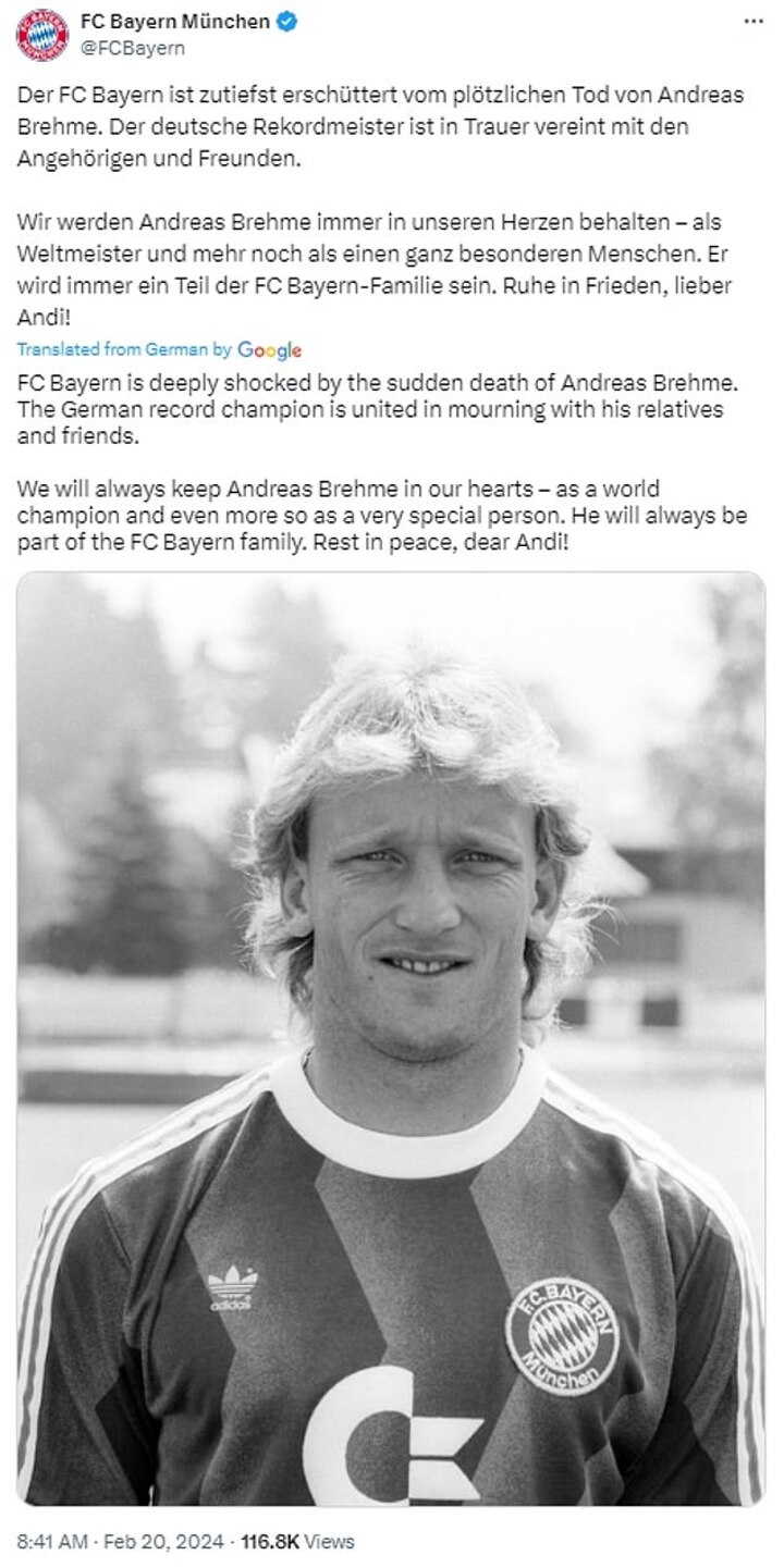 'Andreas Brehme will forever be in our hearts, as a World Cup winner and, more importantly, as a very special person. He will forever be part of the FC Bayern family. Rest in peace, Andi!'