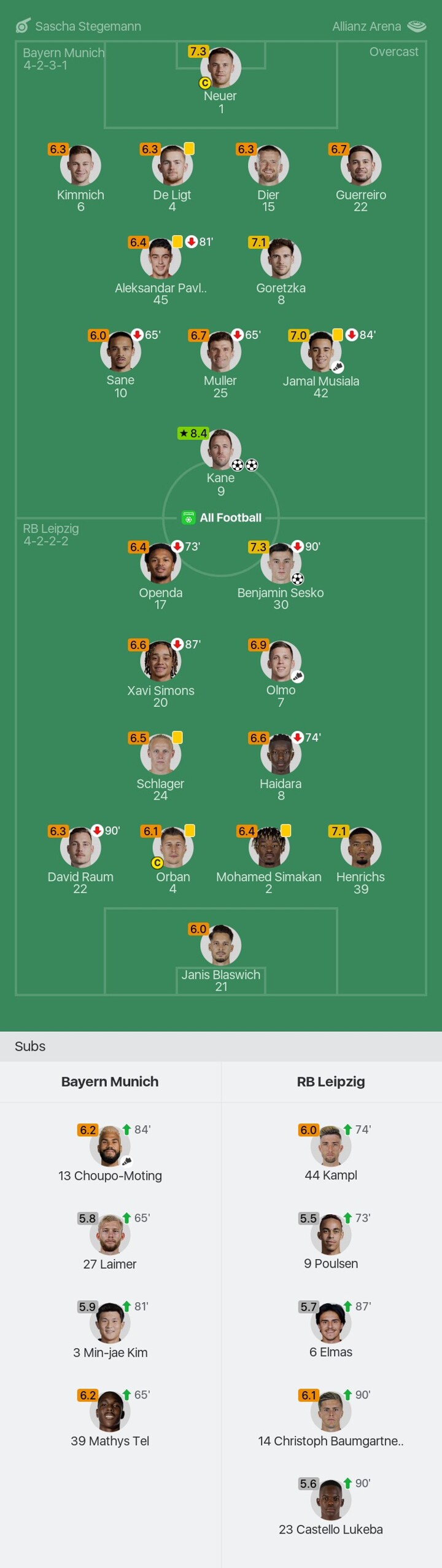 We bring you the player ratings for Bayern Munich vs RB Leipzig as Kane becomes Man of the Match with a rating of 8.4.
