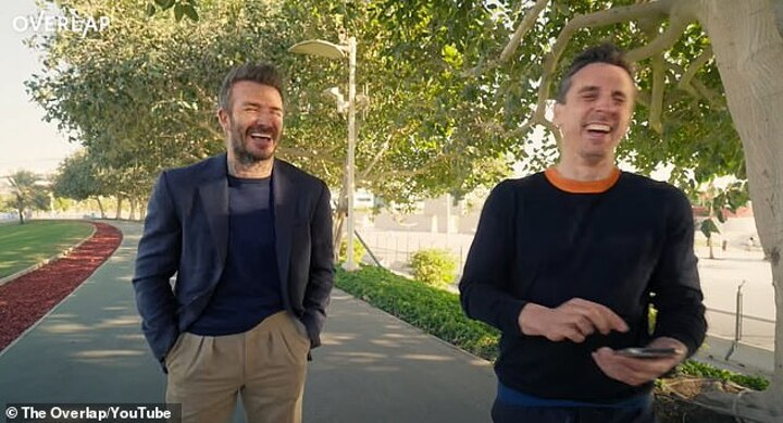 Beckham replied: 'Actually, I forgot about that one, yeah! That one. We'll say the halfway line one' as the pair cracked up laughing.