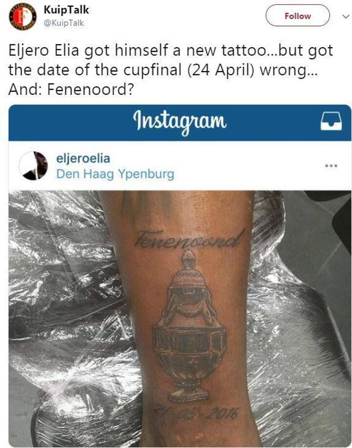 Feyenoord winger Elia had a stinker with this tattoo back in 2016, but got it corrected to display the correct details.