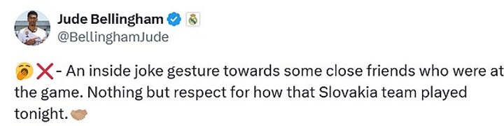 The player himself was quick to take to social media to point out that the act was an in joke aimed towards close friends who were in the stands. 'Nothing but respect for how that Slovakia team played tonight,' he added, on X.