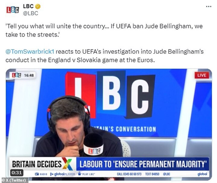 LBC's Tom Swarbrick said the country should 'take to the streets' if the football governing body bans Bellingham.