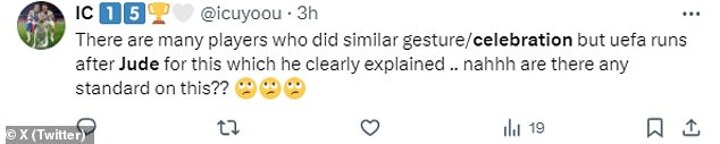 Uefa announced that an inspector 'will conduct a disciplinary investigation regarding a potential violation of the basic rules of decent conduct' by Bellingham 'having allegedly occurred in the scope of this match'.