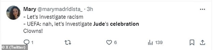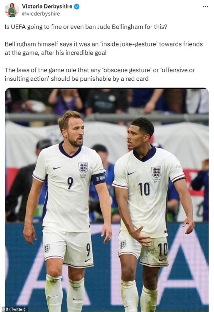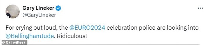 Lineker lashed out at Uefa's investigation as he wrote on X/ Twitter: 'For crying out loud, the @EURO2024 celebration police are looking into @BellinghamJude. Ridiculous!'