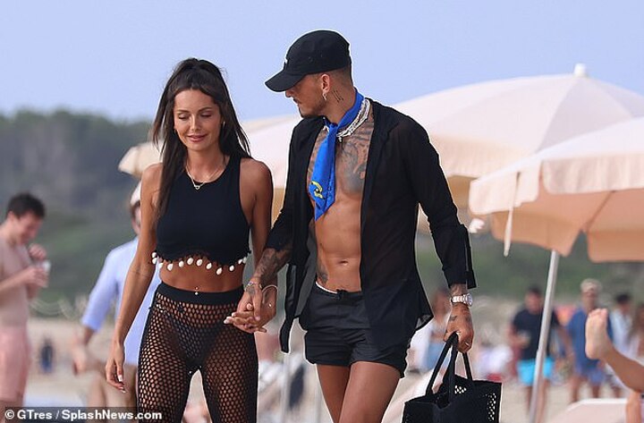 The footballer donned stylish beach attire as he sported black swim shorts and a shirt, which showed his washboard abs and inked skin.