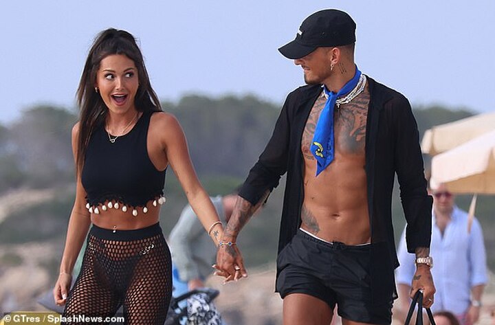 Ben, 25, and Milly, 26, looked smitten in matching black beachwear as they strolled down the beach holding hands and showcasing their incredible physiques.