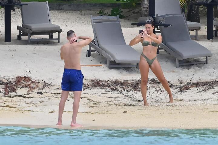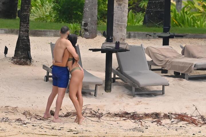 He was spotted in a pair of blue swimming trunks, with Chloe donning a green bikini.