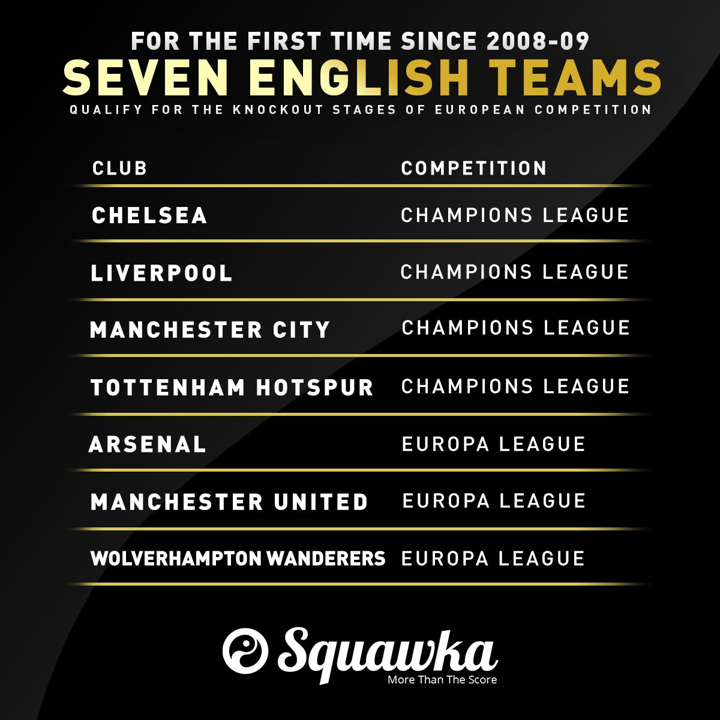 For the first time since 2008-09, seven English teams have qualified for the knock-out stages of European club competitions. And all 7 Spanish teams in the Champions League and Europa League have qualified for the knockout stages.