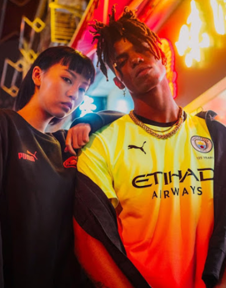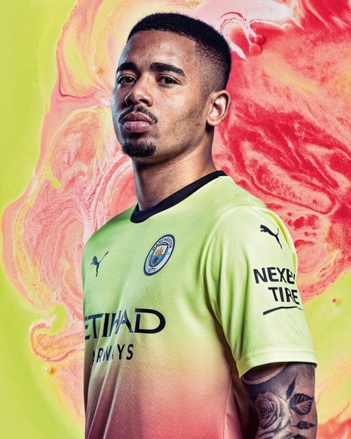 A look that will surely split opinions, the Manchester City 2019-20 third jersey is predominantly yellow ('fizzy yellow') fading towards the peach ('georgia peach') at the bottom, with black accents.