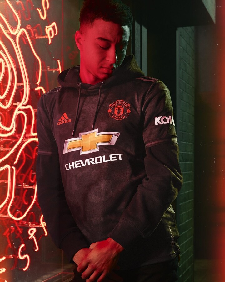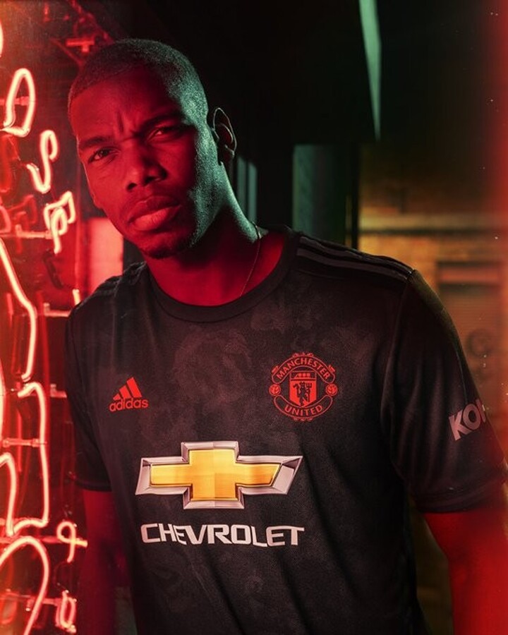 The Manchester United 2019-2020 third kit is predominantly black with bright red logos on the chest and tonal 3 Stripes on the shoulders.