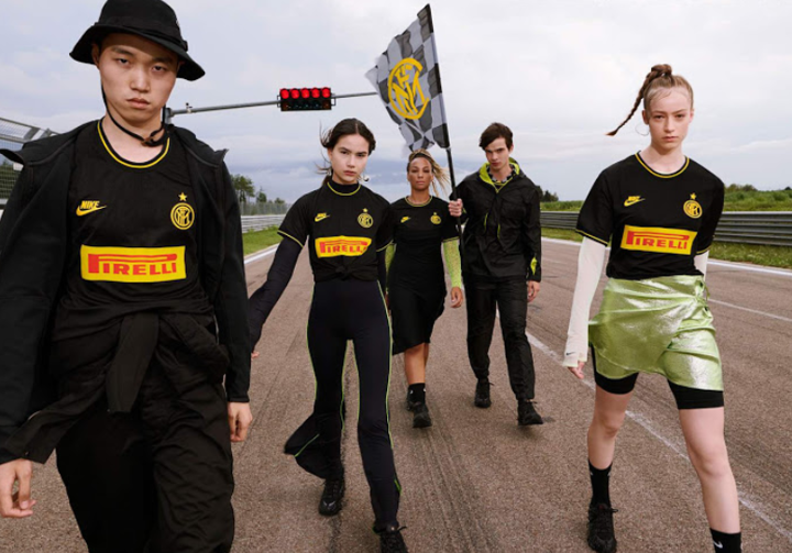 The Inter 19-20 third jersey is black with club and supplier logos appearing in yellow. The Pirelli logo on Inter Milan's 2019-2020 third shirt appears in its default, which is a first for the Inter jersey.