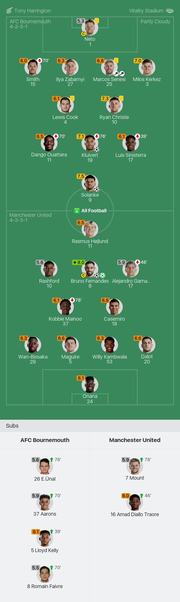 We bring you the player ratings for AFC Bournemouth vs Manchester United as Bruno Fernandes becomes Man of the Match with a rating of 8.0.
