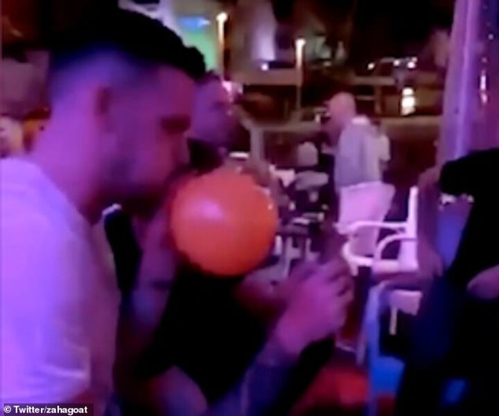 Jahanbakhsh, sitting near a woman with dark hair, is seen inhaling from a balloon. The camera then pans across to Trossard and Duffy, both in black, with balloons and then midfielder Gross, in a white T-shirt.