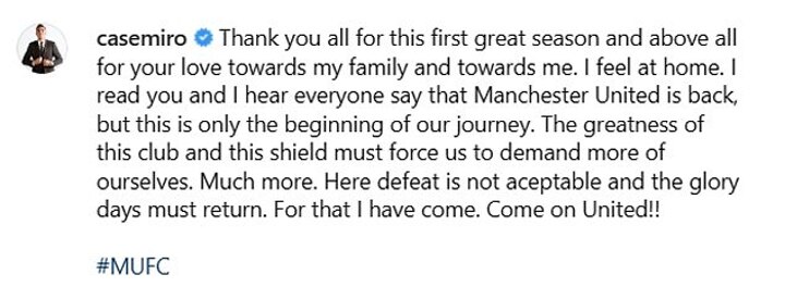 In a post on Instagram on Monday following the showpiece event at Wembley, Casemiro thanked the club's fans for their support this season, but insisted he expects more from his side in the 2023-24 campaign.
