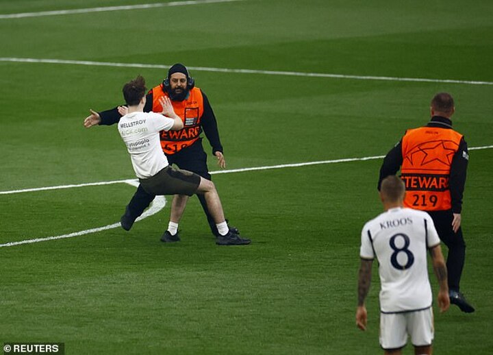 Play was halted when the three troublemakers darted onto the turf of European football's showpiece match between Dortmund and Real Madrid.