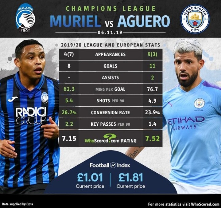 Atalanta are set to face Man City in the UCL tonight. In their last clash 2 weeks ago, City thrashed their rivals 5-1 at home. What will happen at Atalanta's home? We provide you with the Head to Head stats between Muriel and Aguero.