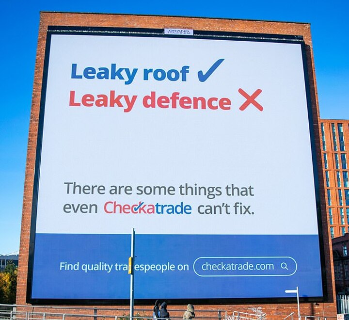 Within a stone's throw of Old Trafford, images showed a Checkatrade poster that read: 'Leaky roof' alongside a tick, before adding 'Leaky defence' with a cross next to it.