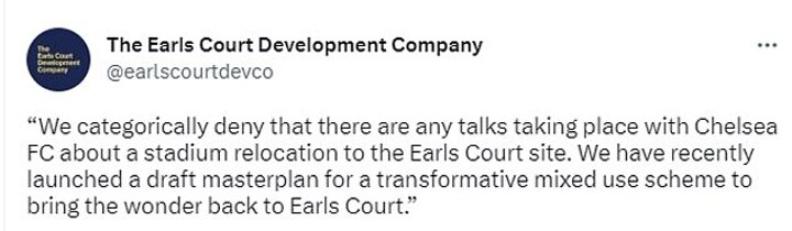 But they have insisted they are not in talks with the Blues over a move. An ECDC statement on Twitter said: 'We categorically deny that there are any talks taking place with Chelsea FC about a stadium relocation to the Earls Court site.