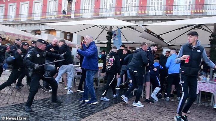 The scuffles broke out in the Plaza Mayor square in the Spanish capital and were caught on camera, with clips of drinks being thrown quickly surfacing online.