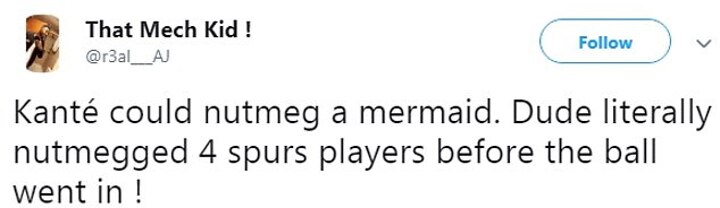 'Kante could nutmeg a mermaid. Dude literally nutmegged 4 spurs players before the ball went in,' wrote one fan on Twitter.