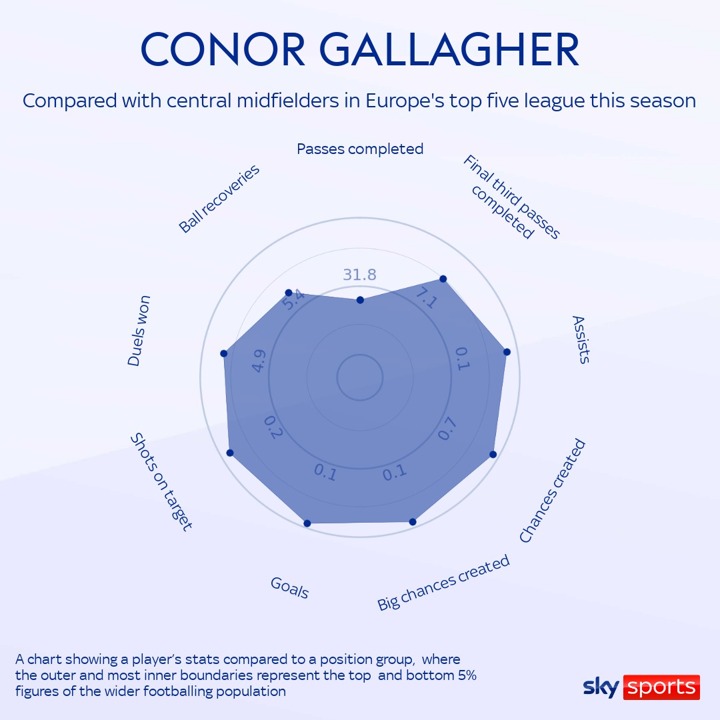 The radar graphic below is perhaps the clearest indication of just how impressive Gallagher has been this season. When matched up against all central midfielders in Europe's top five leagues, the Chelsea loanee ranks among the elite for goals, assists, creating chances, third-third passes shots and winning duels. A true all-rounder.