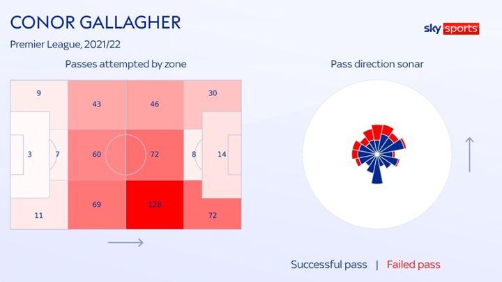 The graphic below shows where Gallagher typically operates on the ball, with the majority of his passes being made down his favoured right channel of midfield but with frequent forays into central areas and into the opposition box.