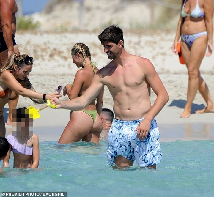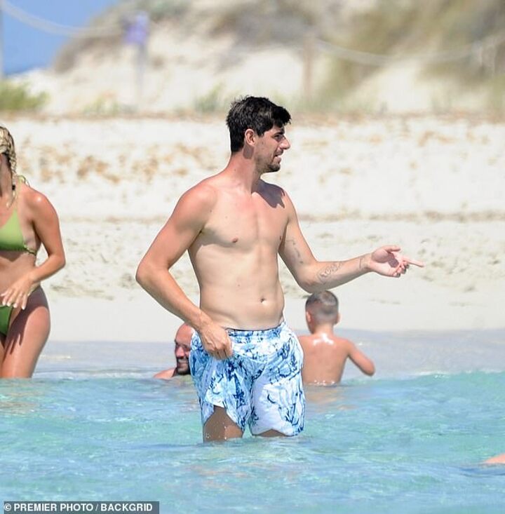 The Real Madrid and Belgian goalkeeper, 31, and his model wife, 26, looked in high spirits as they relaxed on the sand and took a dip in the sea.